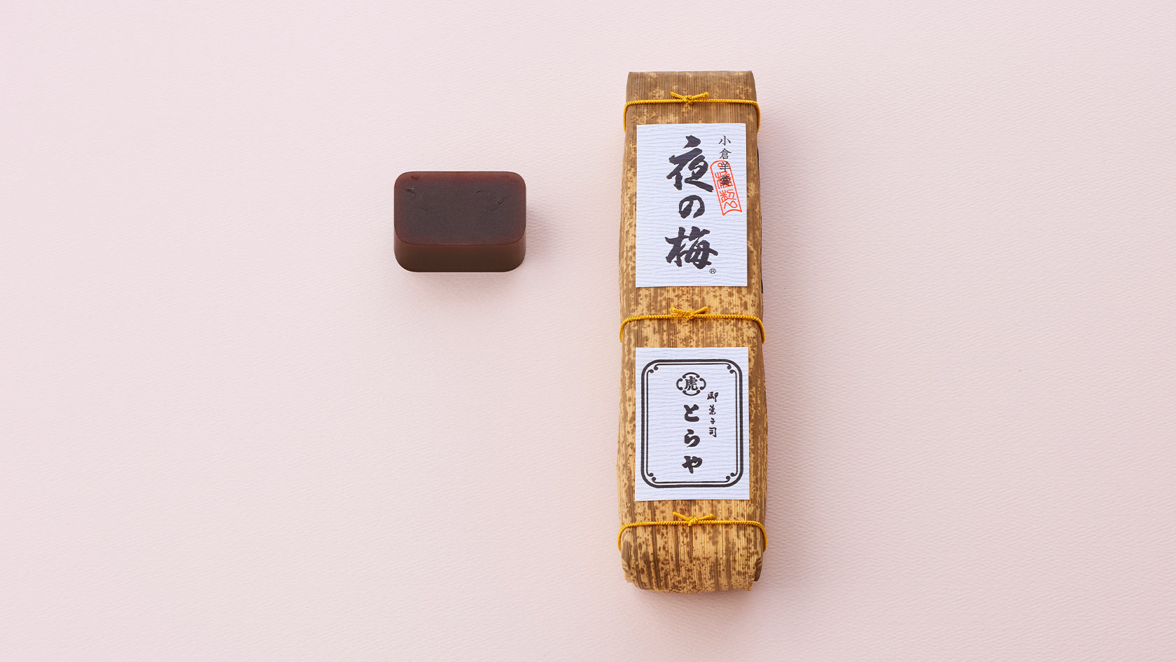Currently one of Toraya's most popular products. When sliced, the whole azuki beans in the yokan evoke the glimmer of white plum blossoms in the dark night and their wonderful scents drifting on the air.
