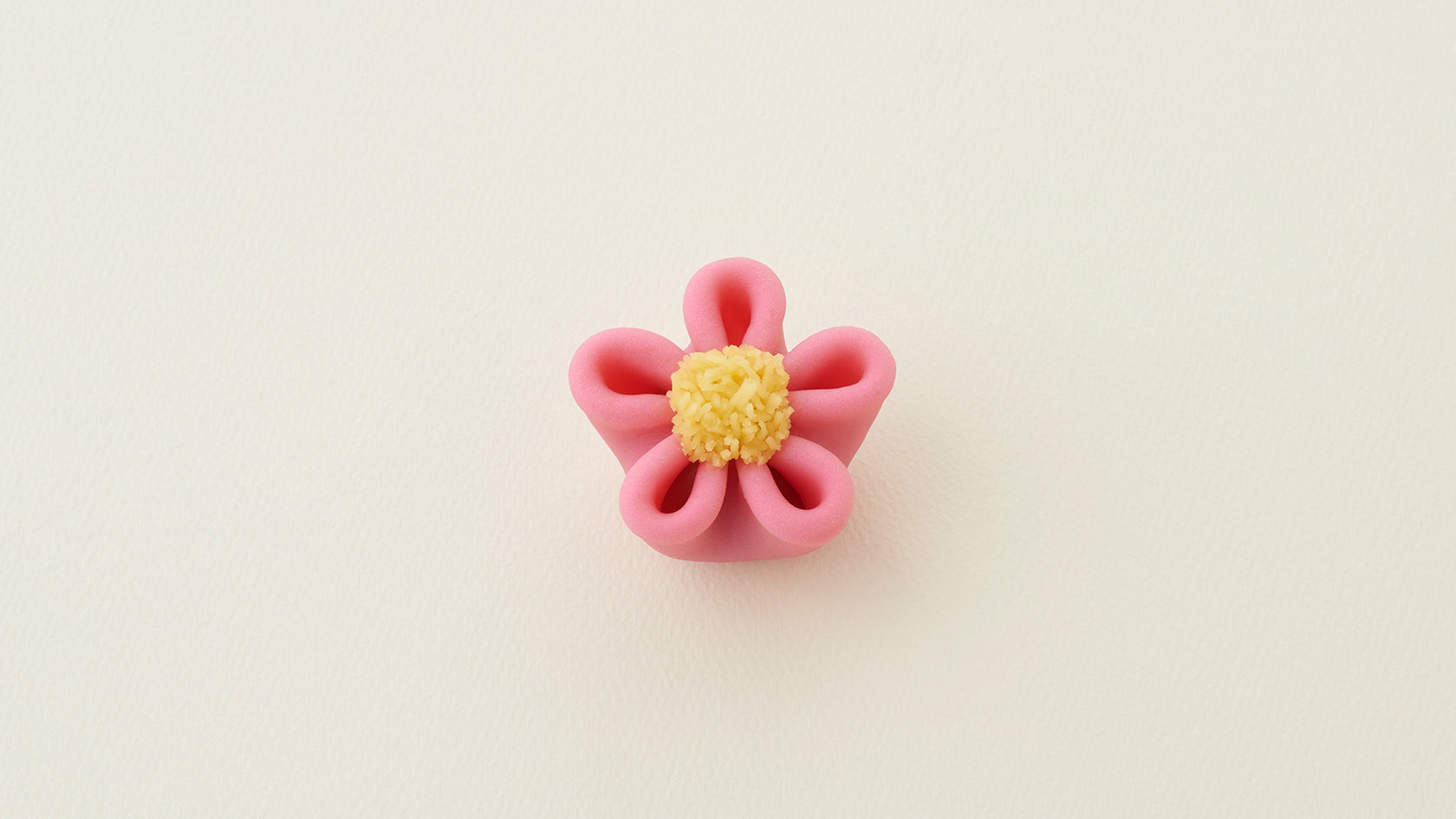 Plum blossoms have long been known as the earliest to flower as a sign of the coming spring. This sweet depicts a single pink plum blossom braving the cold. A mixture of steamed bean paste and flour shaped into a five-petal plum blossom envelops whole white azuki bean paste. Bright yellow, crumbled, fluffed bean paste forms the center.
