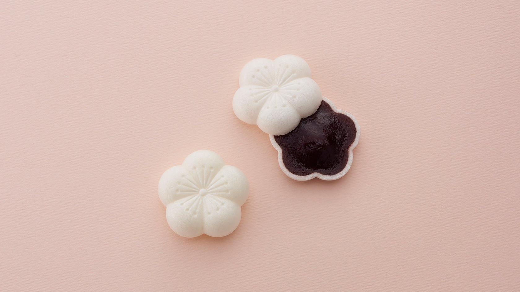 White wafers symbolizing plum blossoms, filled with smooth azuki bean paste. The auspicious name carries a wish for an era of lasting peace.