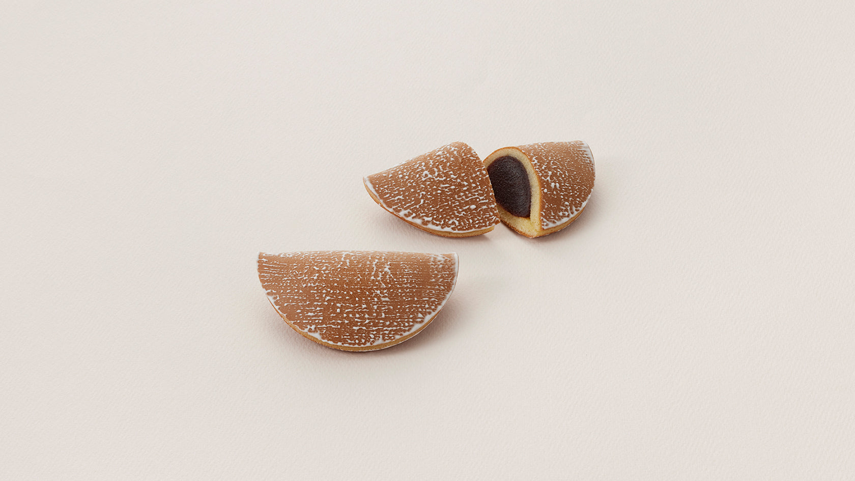 Ginger-flavored wheat flour pancake baked slightly firm. It is folded to make a half-moon shape and filled with smooth azuki bean paste. The name of this confection alludes to the fading form of the moon at dawn, and the drizzle of icing represents a thin veil of clouds.